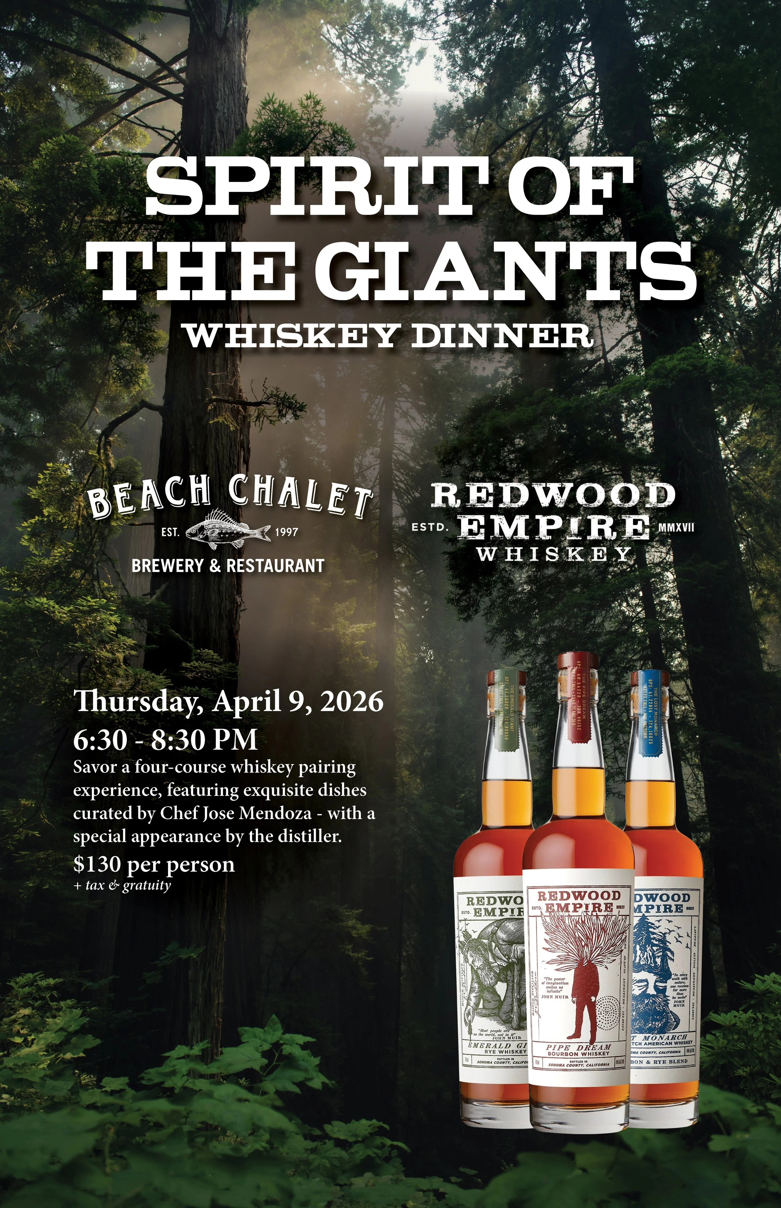 Join us at Beach Chalet for Spirit of the Giants, a seated four-course oceanfront whiskey dinner featuring curated pairings from Redwood Empire Whiskey. The evening takes place in our Ocean Vista Room as the sun sets over Ocean Beach, with signature cocktails and premium pours served alongside each course - and a special appearance by the distiller.