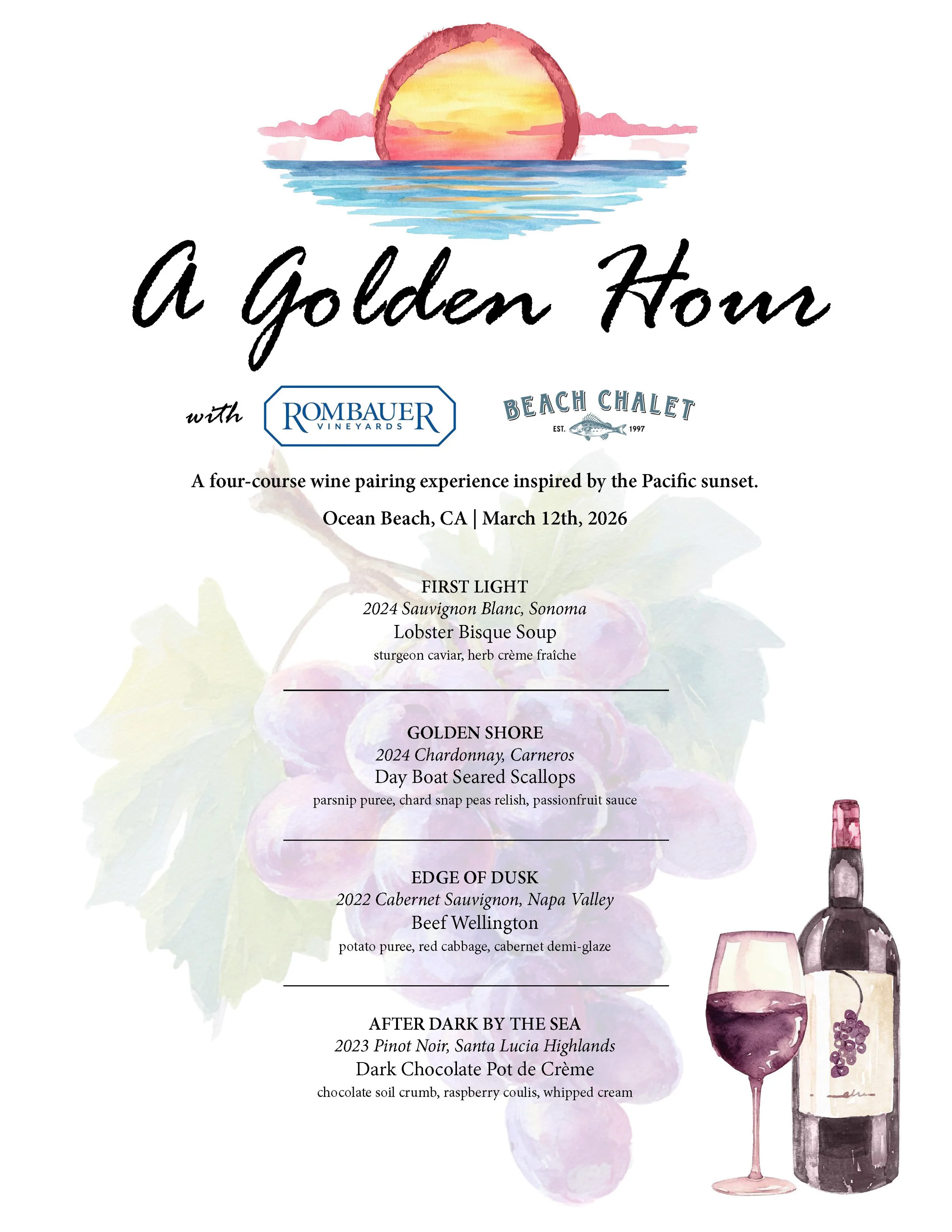 Join us at Beach Chalet for A Golden Hour, a seated four-course oceanfront wine dinner featuring paired selections from Rombauer Vineyards. The evening takes place in our Ocean Vista Room as the sun sets over Ocean Beach, with wines poured alongside each course.